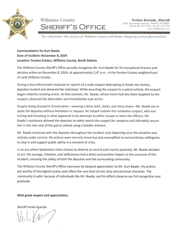 A big thank you to our Funeral Director, Kurt Baade, for stepping up to help a Williams County Sheriff during a recent incident in Williston. We’re proud of his quick action and dedication to helping others — both on and off the job!